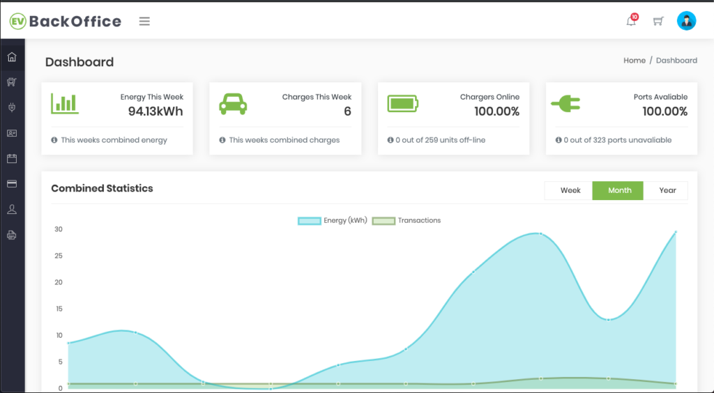 The platform provides a central view point of your installed charge point network while providing you with the tools to remotely manage these charge points and gain insights in the health of your EV charge Point network. EVBackOffice provides an easy to use system giving the network operator the ability to configure various Charge Point parameters remotely. Various reports are available to view Charge Point availability, transaction count, energy usage and